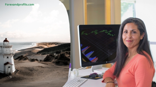 Forex trading chart with free MT4 indicators and a smiling woman standing outside the screen