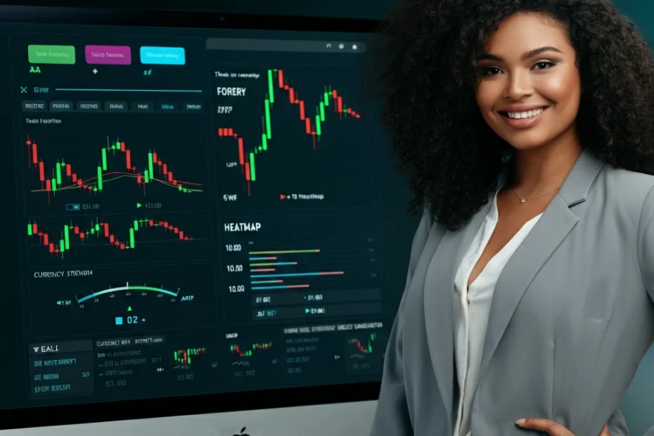 Forex trading chart with free MT4 indicators and a smiling woman standing outside the screen